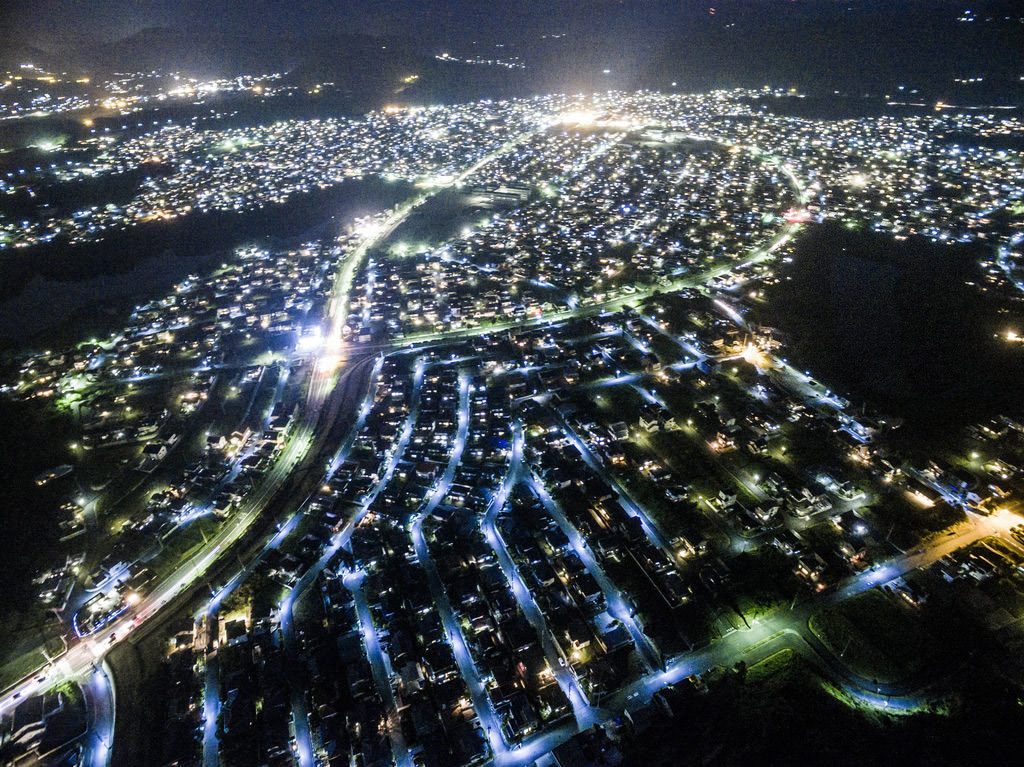 18. Night In The City Of Aikawashi. Okayama, Japan – You can see the buildings and streets lit up with car lights, house lights, and street lights.