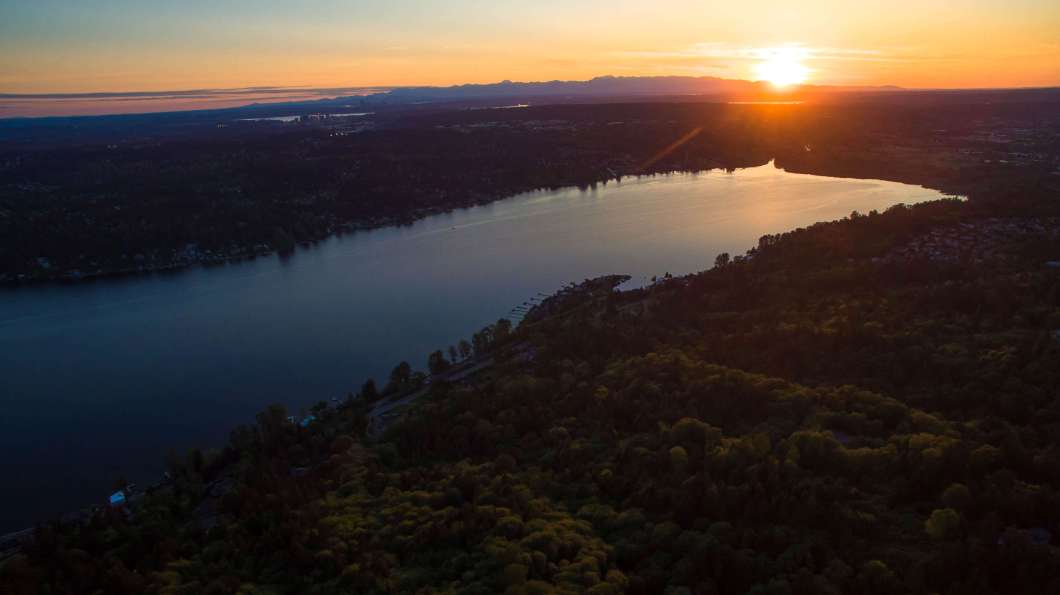 15. Sunset at Lake Sammamish, Washington – You can see how the sun is disappearing behind a distant hill and rays of light reflect of the water.
